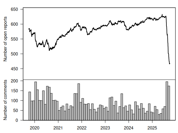 The plot (thanks to Sebastian Meyer) shows the number of open bugs and number of comments in the R bug tracker from October 1, 2019 to September 30, 2025. It is a variant of the plot in Kalibera & Meyer, “Changes in R”, The R Journal, 2024 and such summaries provided in the previous years.